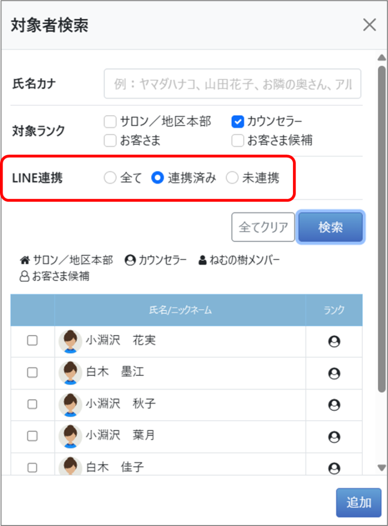 これまでは、対象者選択するときに、「LINE連携をしている方」を判別できませんでした。