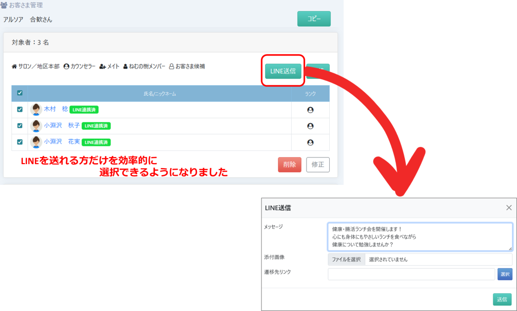 送信対象は、LINE連携済みの組織および、アルソアメンバーズ連携しているお客さまです。