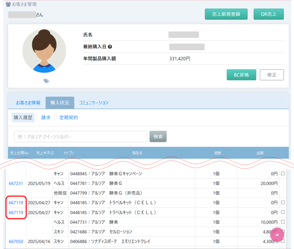 お客さま管理>お客さま詳細>購入状況タブ>購入履歴タブ